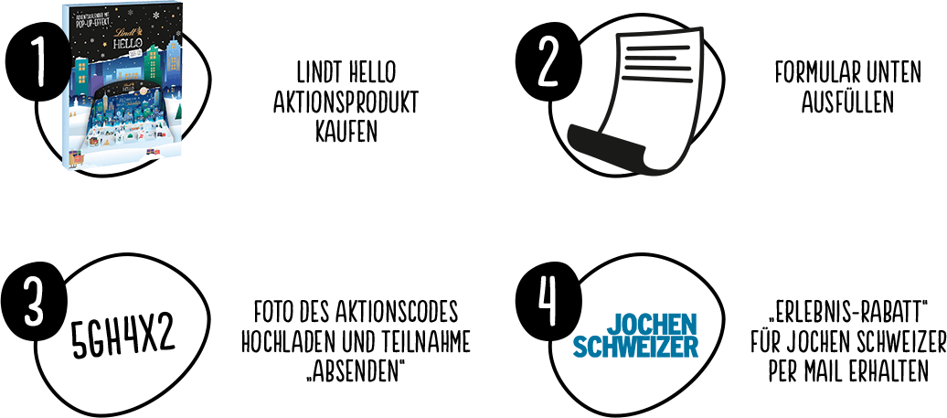 Mehrfachteilnahmen am Gewinnspiel sind erlaubt. Jeder Aktionscode kann allerdings nur einmal teilnehmen. Die Teilnahme am Gewinnspiel ist vom 01.10.2024 – 31.01.2025 möglich. Die Teilnahme erfolgt über die Lindt Website unter www.lindt.de/jochen-schweizer