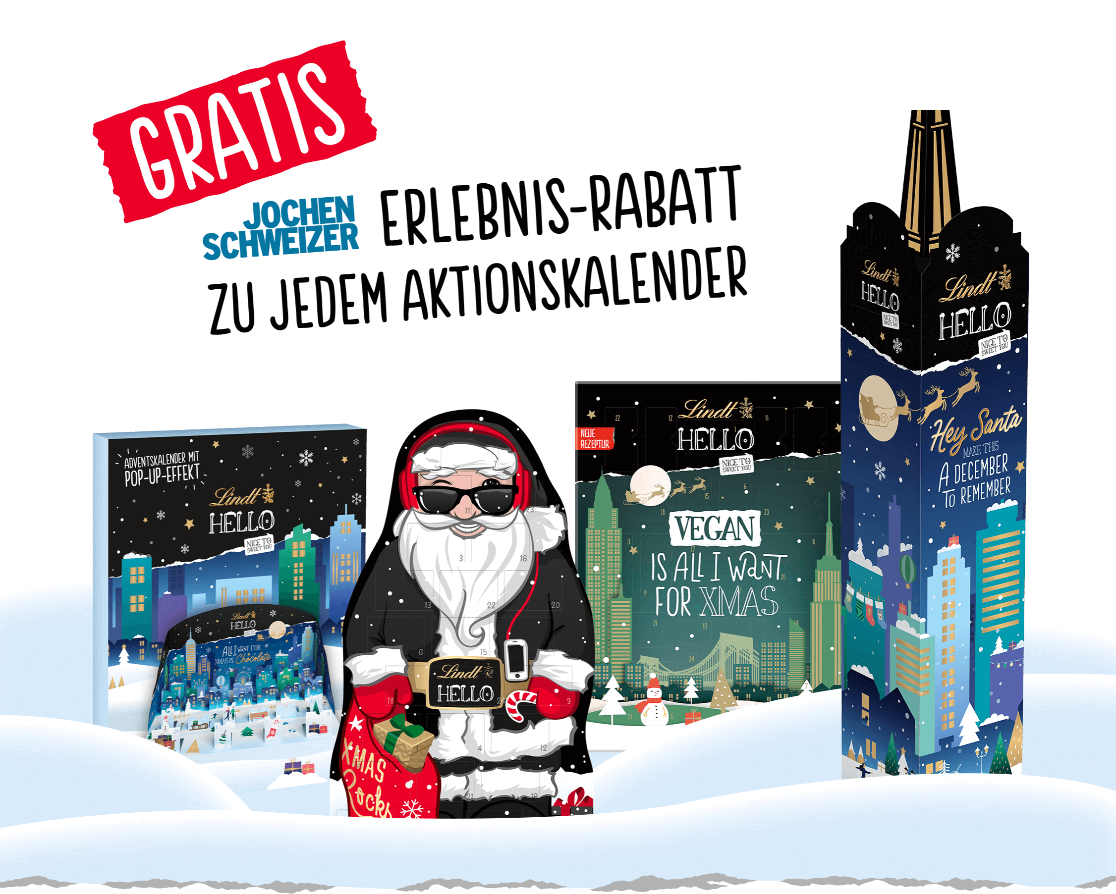 Entdecke die süße Seite des Winters mit der aufregenden Kooperation von Lindt und Jochen Schweizer! Unsere 4 HELLO Adventskalender versüßen nicht nur die Vorweihnachtszeit sondern bieten garantiert unvergessliche Erlebnisse. Jeder Kalender garantiert einen Erlebnis-Zuschuss von Jochen Schweizer zwischen 10€ und 200€ – ein besonderes Geschenk, das die Vorfreude auf die Feiertage noch erhöht.